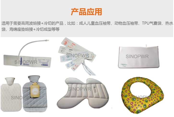 產(chǎn)品應(yīng)用: 適用于需要高周波熔接+冷切的產(chǎn)品,比如:成人兒童血壓袖帶,動物血壓袖帶,TPU氣嚢袋,熱水袋,海綿座墊,APET吸塑熔接+冷切成型等等