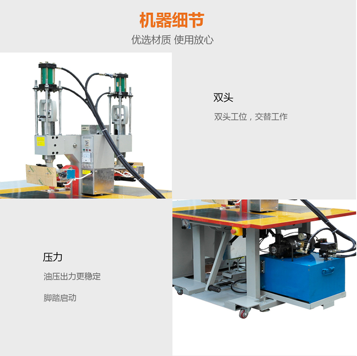 油站雙頭高周波熔接機(jī)適合于鞋材成型、吹氣玩具的高周波熔接、皮革真皮壓花、門(mén)墊腳墊地毯小面積焊接、等高周波制品加工。