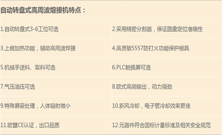 自動轉(zhuǎn)盤式高周波熔接機常用于PVC、PETG雙面吸塑泡殼封口包裝,吸塑吊卡封口包裝,雙面紙卡夾吸塑罩熱合封口包裝,吸塑包裝。