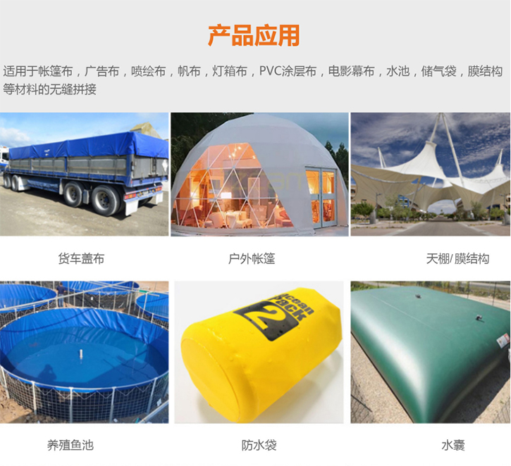 專用于PVC涂層布、PA/PU銀膠涂層布、快速卷簾門、戶外膜結(jié)構(gòu)、遮陽布、廣告噴繪布、軟體沼氣池、沼氣儲氣袋、軟體儲油罐水池等材料的的無縫拼接。