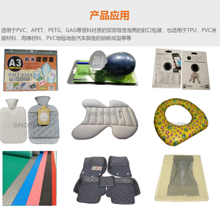 常用于門墊壓花、門墊焊接、地墊焊接、腳墊壓花、充氣床墊、吹氣沙發(fā)、吹氣玩具、 雨衣雨具等PVC或PVC含量在10%以上的塑料熔接。