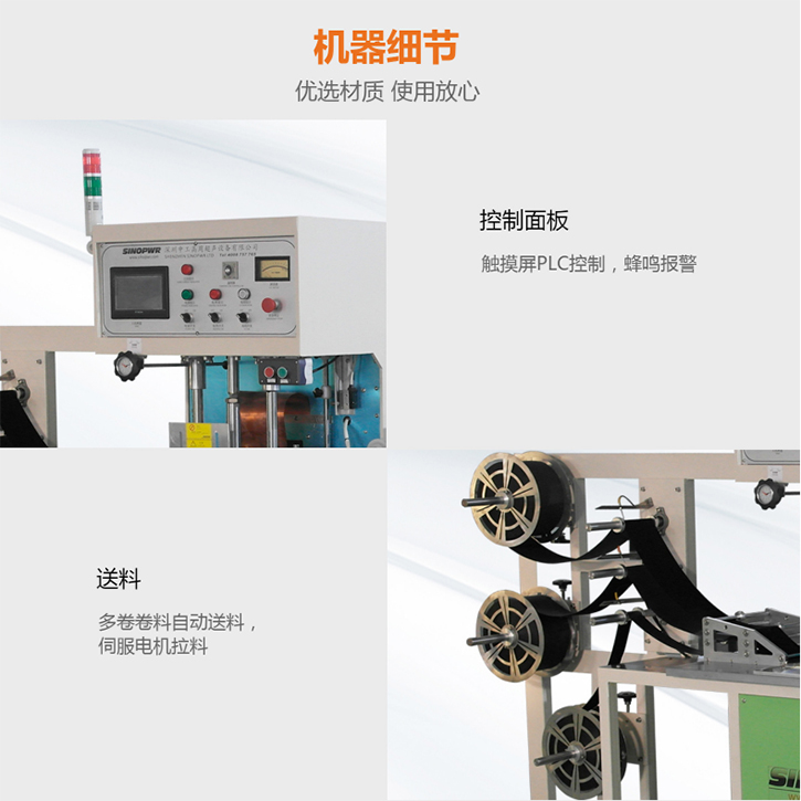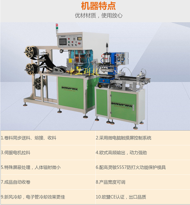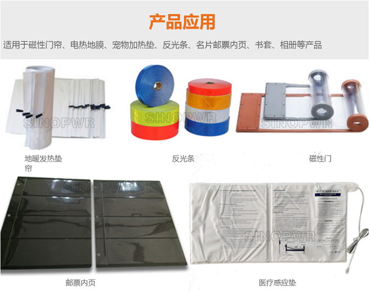 連續(xù)式高周波熔接機(jī)用于名片內(nèi)頁(yè)、書(shū)套、相冊(cè)、PVC袖套、PVC膠袋的成型制做,也可以用于PVC、EVA、PP膠盒柔軟壓線(xiàn)膠盒成型等。