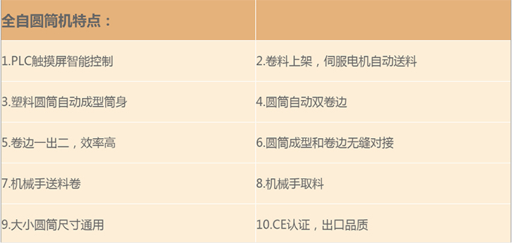 全自動(dòng)圓筒生產(chǎn)線適用于各種PVC、APET、PETG塑料卷材的圓筒自動(dòng)成型,卷邊,封底的圓筒制作,常用于應(yīng)用于高級(jí)巧克利、糖果、化妝品、玩具、工藝品、毛刷、茶葉、食品、文體、日常用品等行業(yè)的圓筒包裝生產(chǎn)。